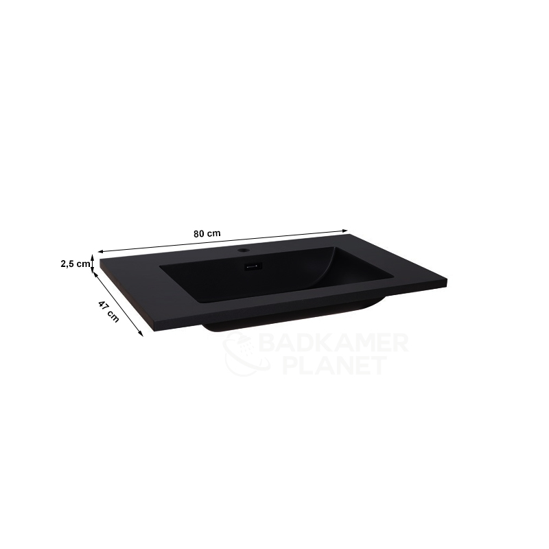 Zoekt u een luxe wastafel mat zwart? De wastafel 80 cm Quartz Classic is een mooie luxe wastafel gemaakt van quartz. De wastafel is 80 cm breed, 47 cm diep en 2,5 cm hoog. Deze mat zwarte wastafel heeft een enkele wasbak met een extra dunne rand en is te combineren met verschillende onderkasten. Maar ook te gebruiken voor een maatwerk onderkast of een topblad/plateau. Beschikbaar in verschillende afmetingen.